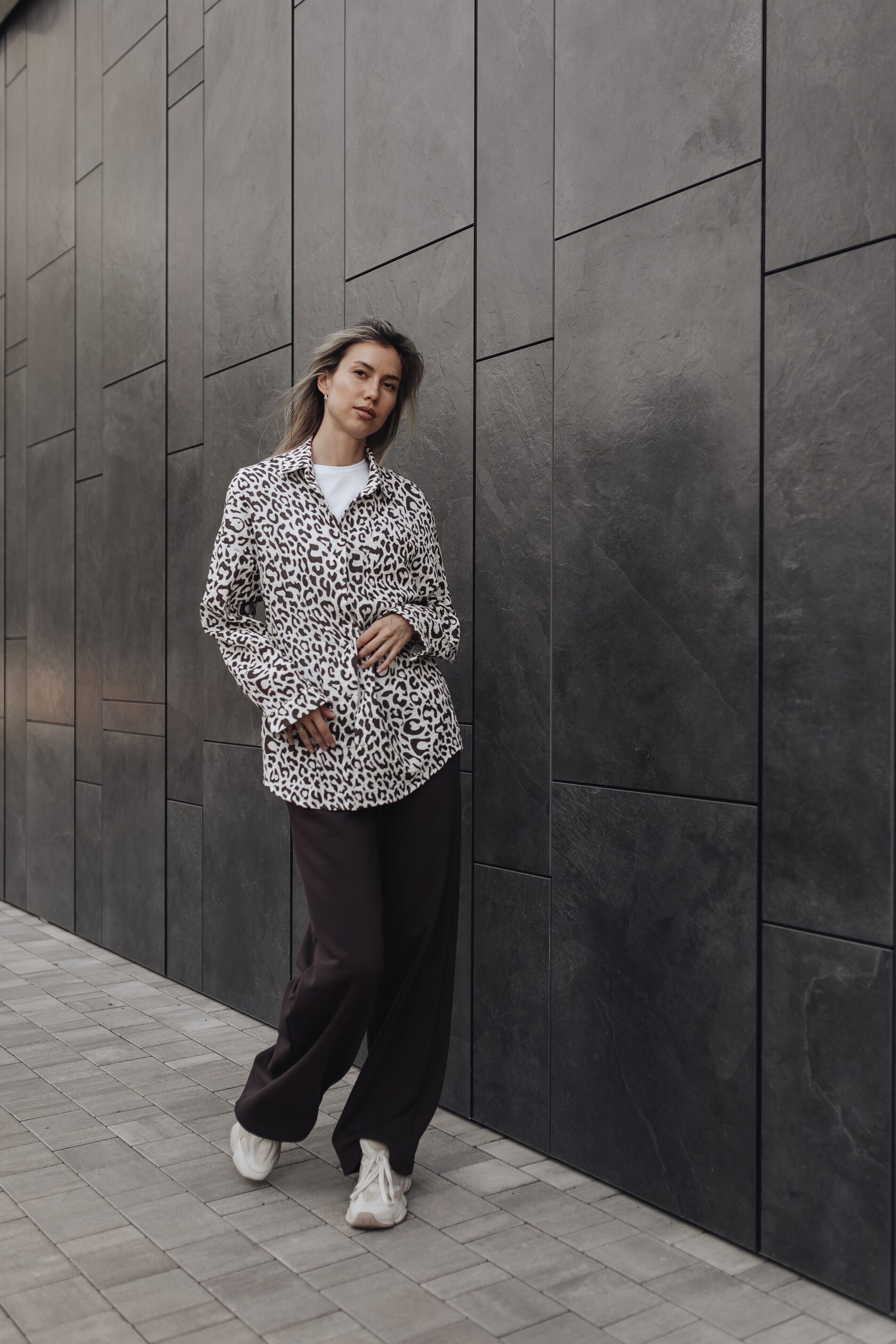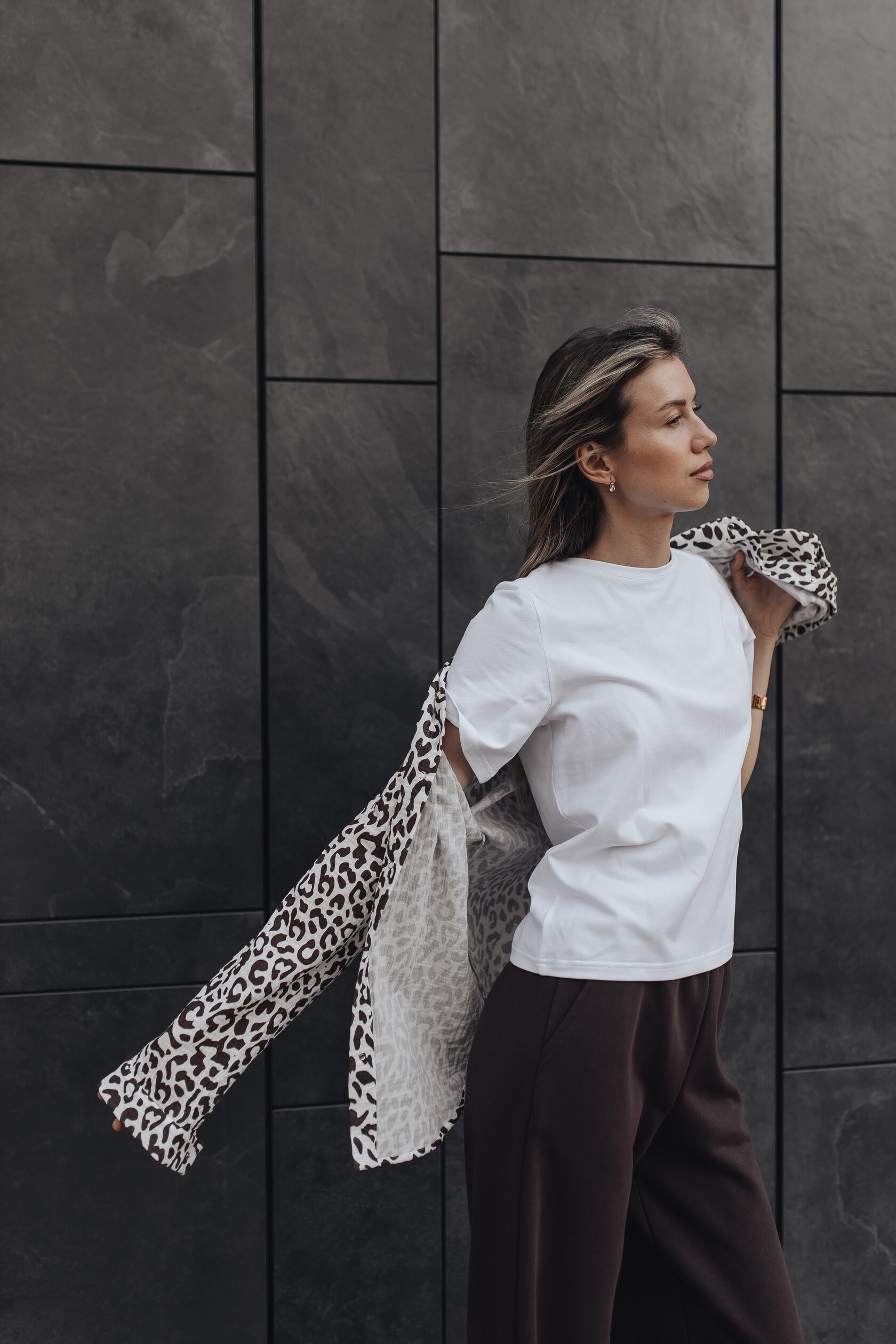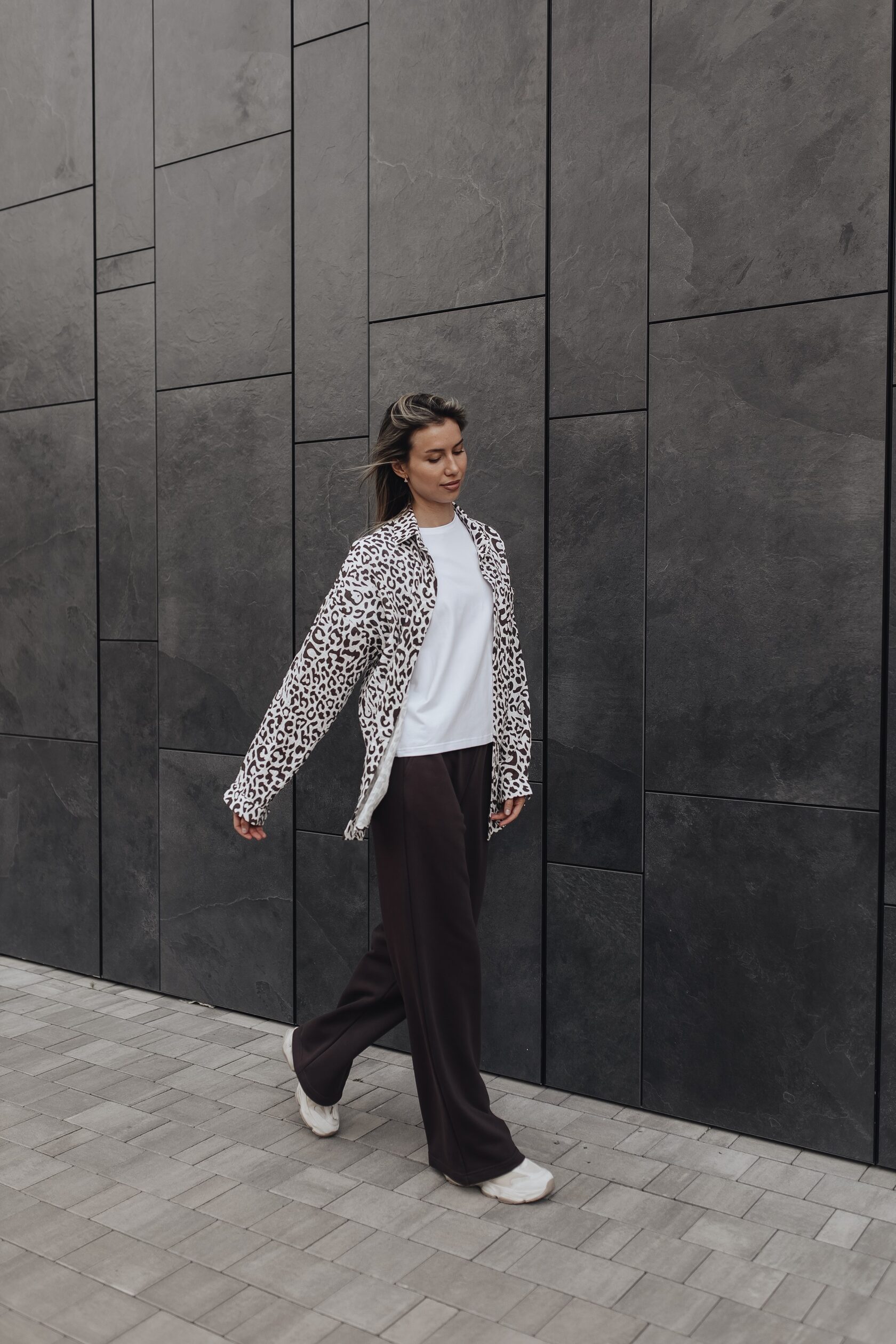 Шикарный комплект на каждый день. Футболка оверсайз черный леопард и брюки спортивные белые. Наш костюм - это тренд сезона, который сочетает в себе комфорт домашней одежды и стиль уличной моды. Он идеально подходит для активного образа жизни, прогулок по городу, путешествий и даже как удобная одежда для дома. Женский трикотажный костюм - идеальное сочетание комфорта и стиля для современной женщины. Этот костюм-двойка станет незаменимым элементом вашего гардероба на все сезоны: от прохладной весны до теплого лета и уютной осени. Максимальный комфорт как для активного отдыха, так и для повседневной носки.