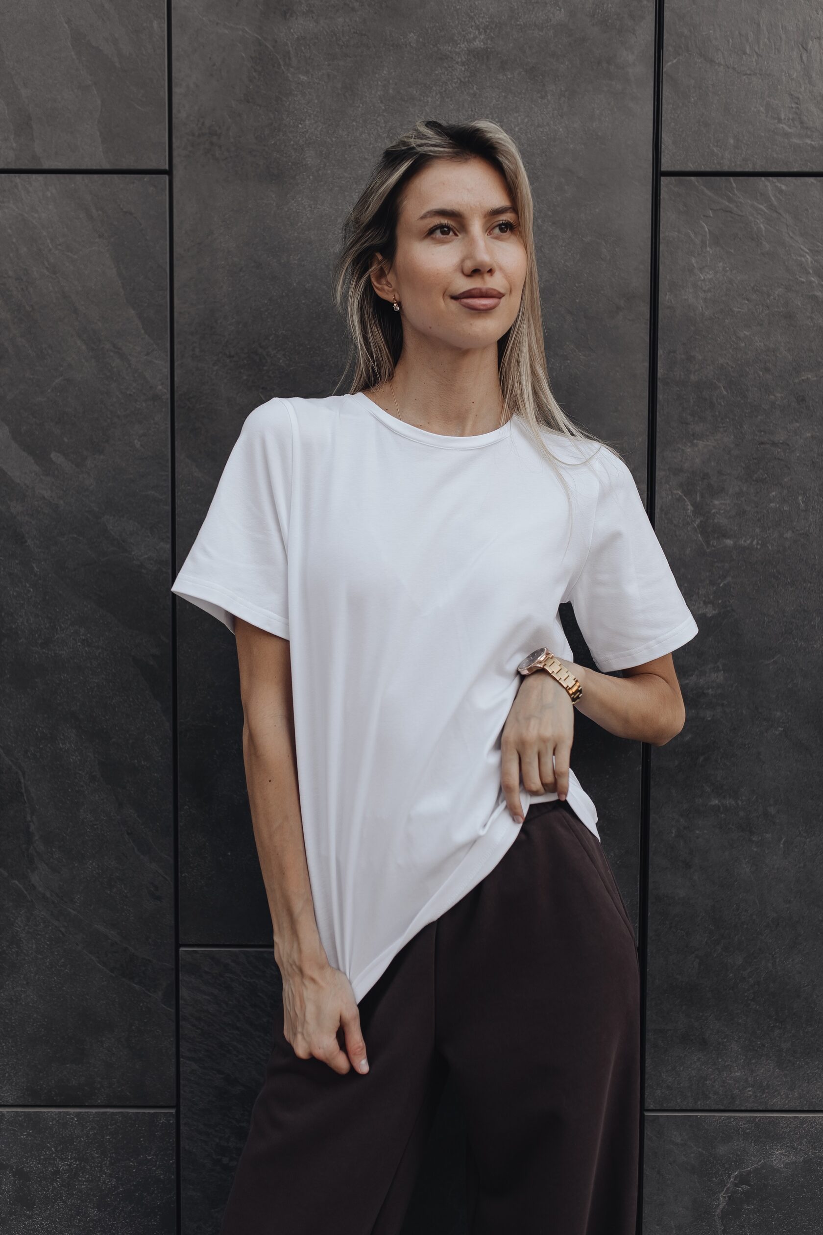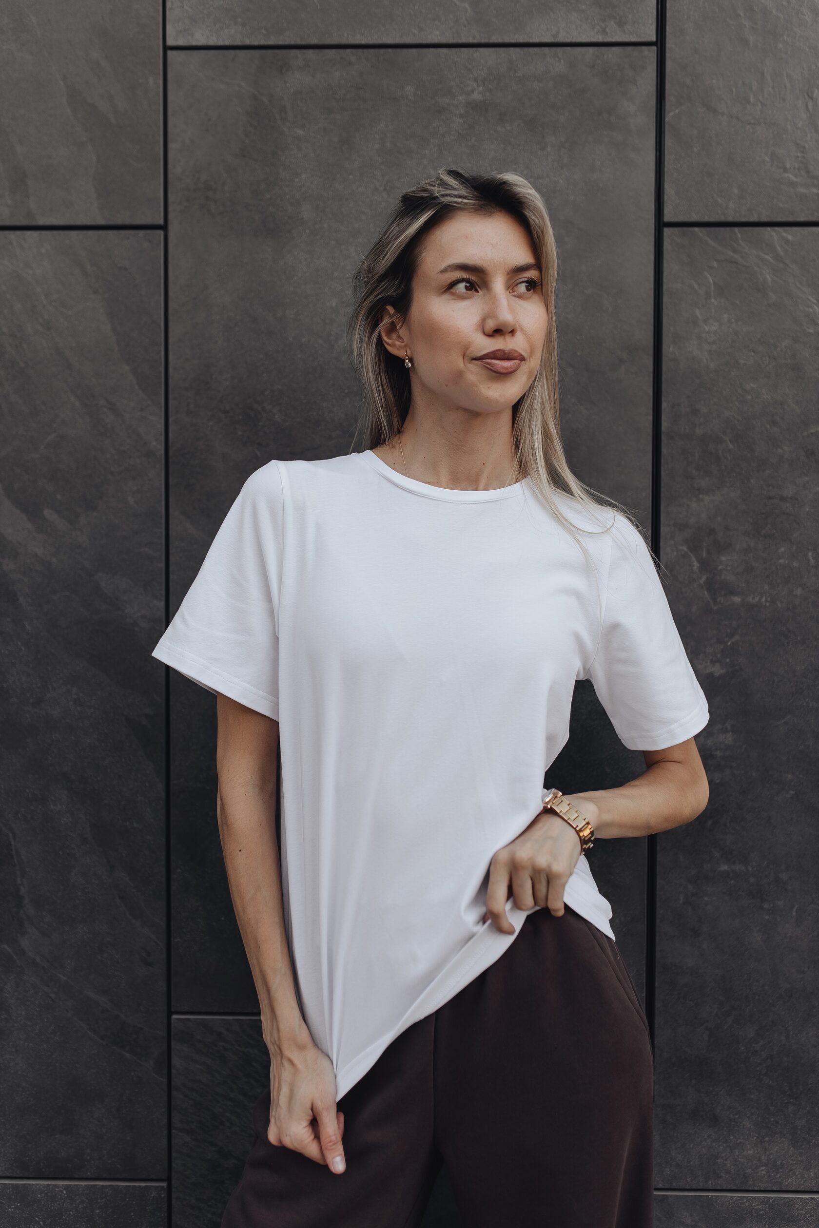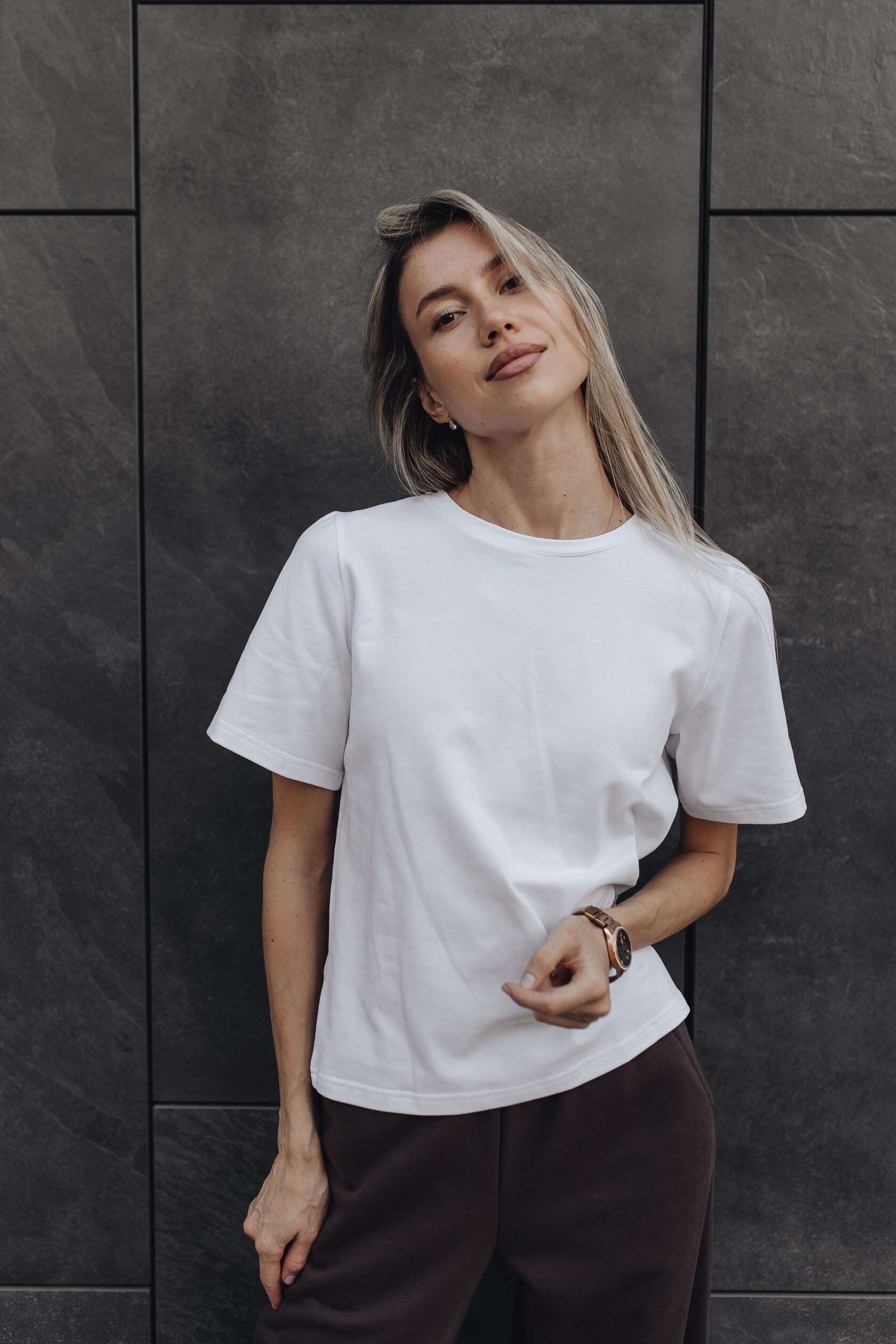 Стильная женская футболка! Хлопковая трикотажная одежда не стесняет движений. Идеальный вариант сочетания с шортами как одежда для дома